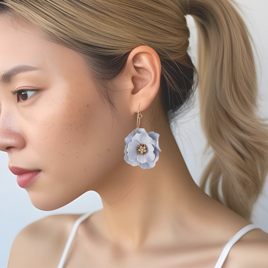 Dainty Blue Flower Earrings, Lightweight Polymer Clay Statement Jewelry, Floral Chic Earrings Clip On