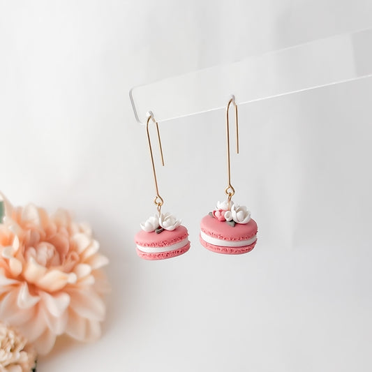 Macaroon Floral Dangle Earrings, Handmade Polymer Clay Jewelry, Floral Clip On Earrings