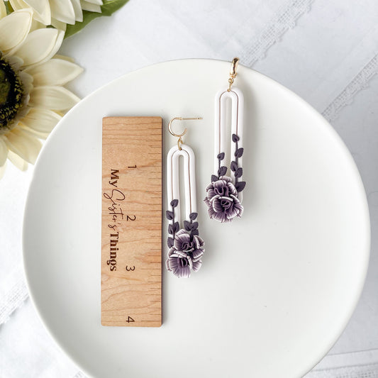 Dainty Purple Flower Earrings, Lightweight Polymer Clay Statement Jewelry, Floral Chic Earrings Clip On