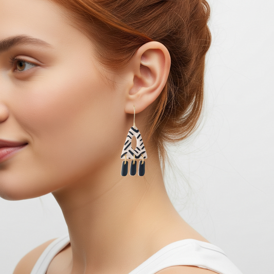 Abstract Black & White Dangle Geometric Earrings, Lightweight Handmade Statement Jewelry, Polymer Clay Clip On