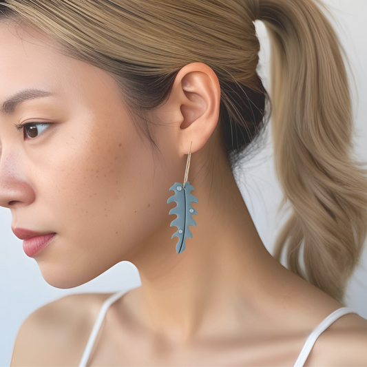 Slate Blue Dewey Leaf Dangle Earrings, Handmade Lightweight Statement Jewelry, Polymer Clay Clip On