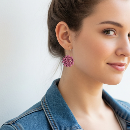 Dewey Mauve Flower Dangle Earrings, Lightweight Polymer Clay Flower Statement Earrings