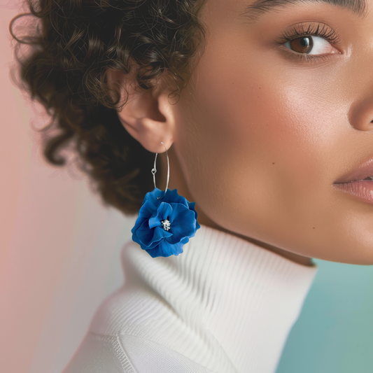 Indigo Blue Flower Earrings, Lightweight Polymer Clay Large Flower Statement Earrings Silver