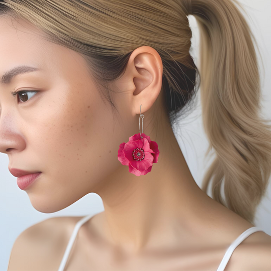 Hot Pink Flower Hoop Earrings, Lightweight Polymer Clay Large Flower Statement Earrings Silver