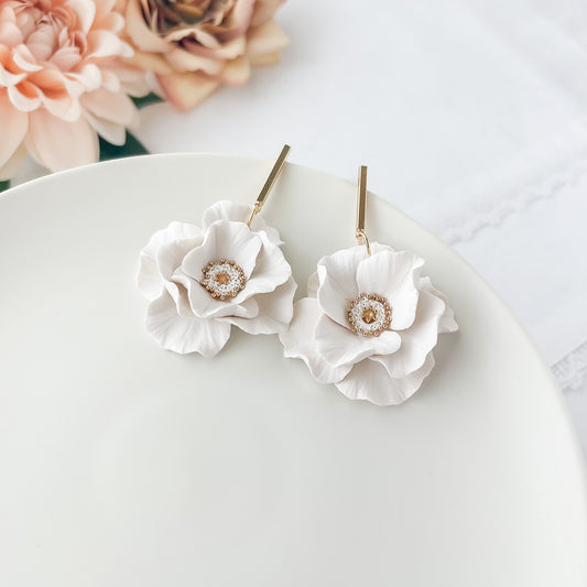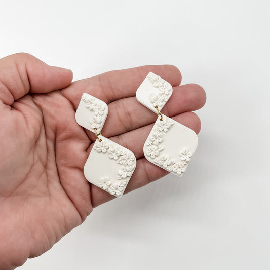 Edgy White Floral Handmade Statement Earrings - Bold, Unique Polymer Clay Dangle Jewelry