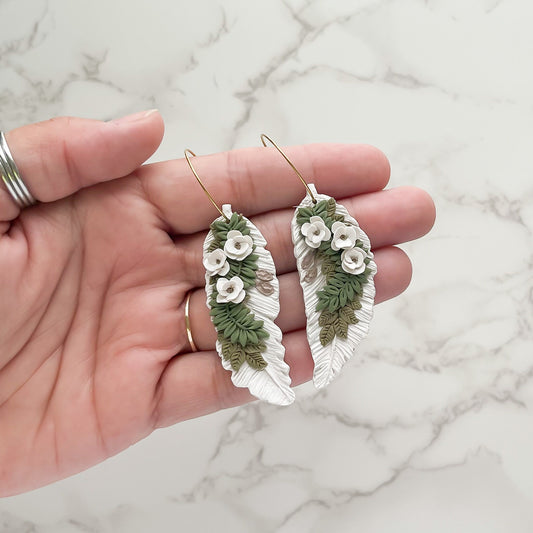 Edgy Handmade Feather and Magnolia Statement Earrings – Unique Boho Chic Artisan Jewelry, Handcrafted in Small Batches
