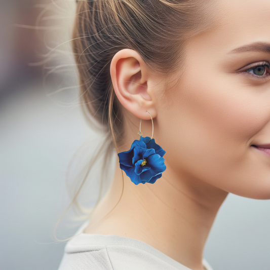 Indigo Blue Flower Earrings, Lightweight Polymer Clay Large Flower Statement Earrings Gold