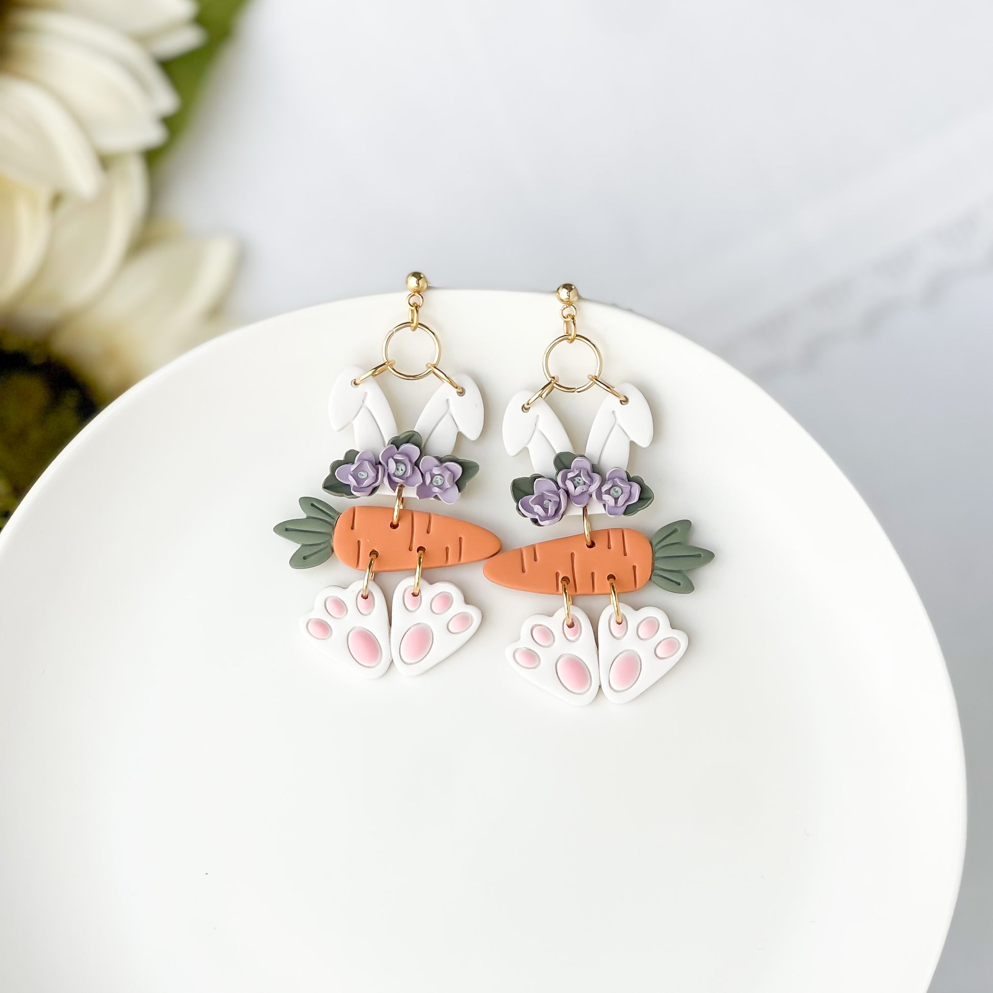 Express your unique style with our Floral Easter Bunny With Carrot earrings! Handmade from lightweight polymer clay, these whimsical statement earrings are perfect for the fashion-forward and sensitive ears alike. Plus, they come with a clip-on option for non-pierced ears. A perfect gift for any earring or jewelry lover!