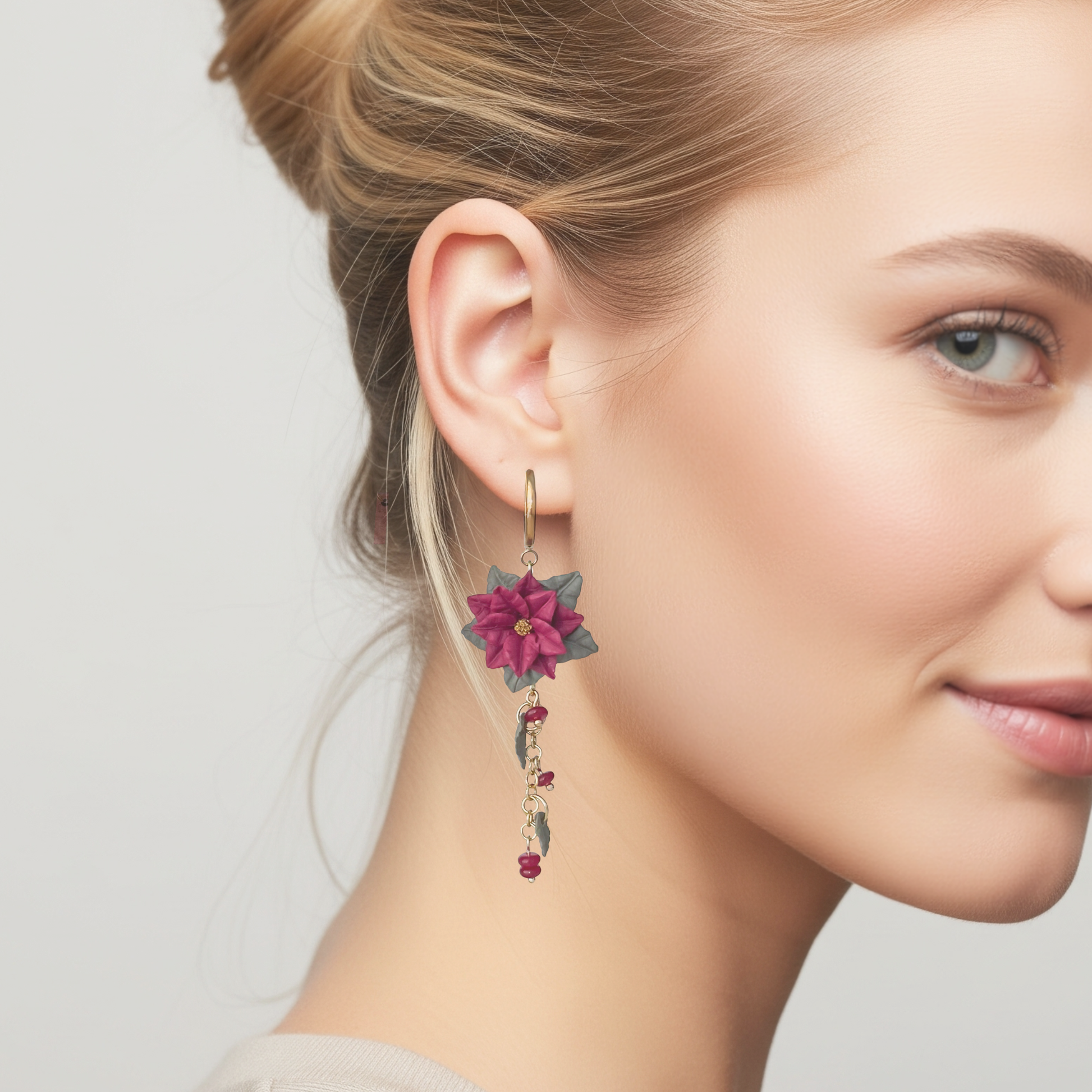 Celebrate the season with these exquisite handmade poinsettia earrings, crafted from lightweight polymer clay for all-day comfort. Perfect for sensitive ears, they feature surgical stainless steel huggie hoops and come with a convenient clip-on option. Each pair is meticulously designed to bring festive elegance to your holiday wardrobe. An ideal gift for the woman who appreciates artisanal jewelry that combines style with thoughtful craftsmanship.
