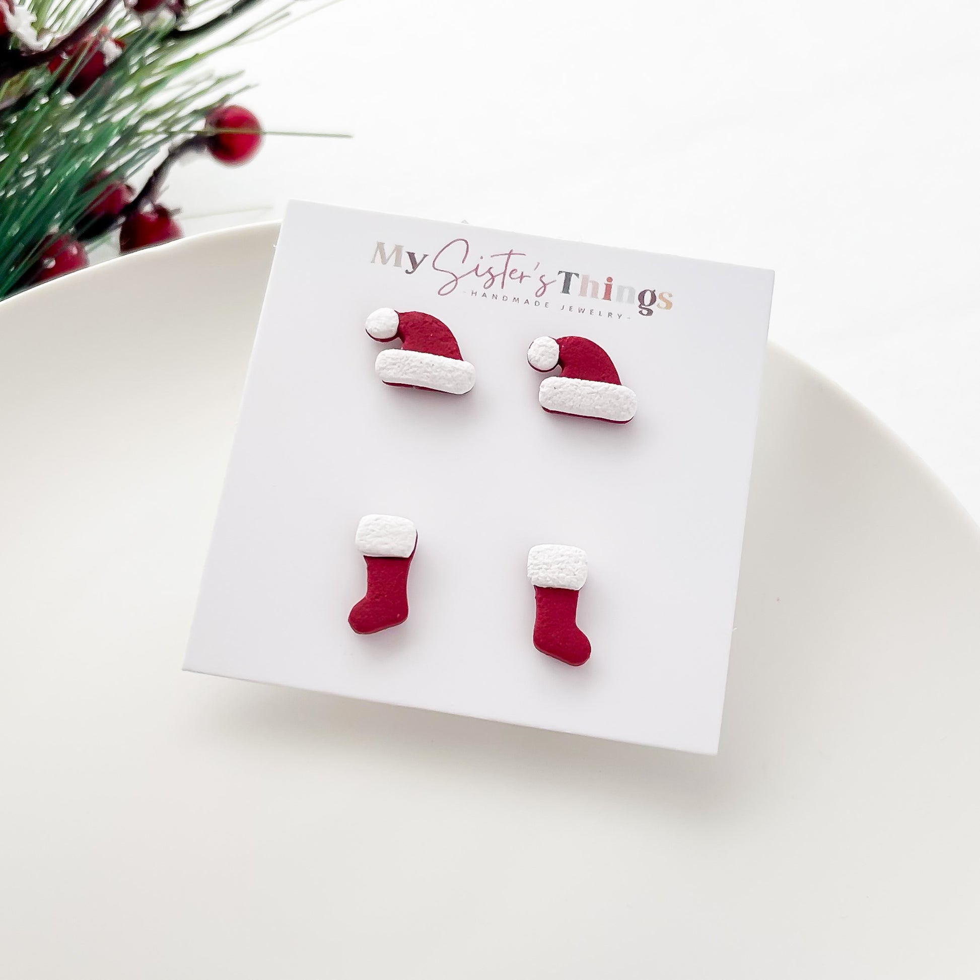 This Christmas stocking and Santa hat clay stud pack will be your favorite holiday stud pack. They're made of lightweight, polymer clay with stainless steel posts that are hypoallergenic for sensitive ears and long-term wear. These earrings will be a fun addition to your jewelry box this Christmas season.