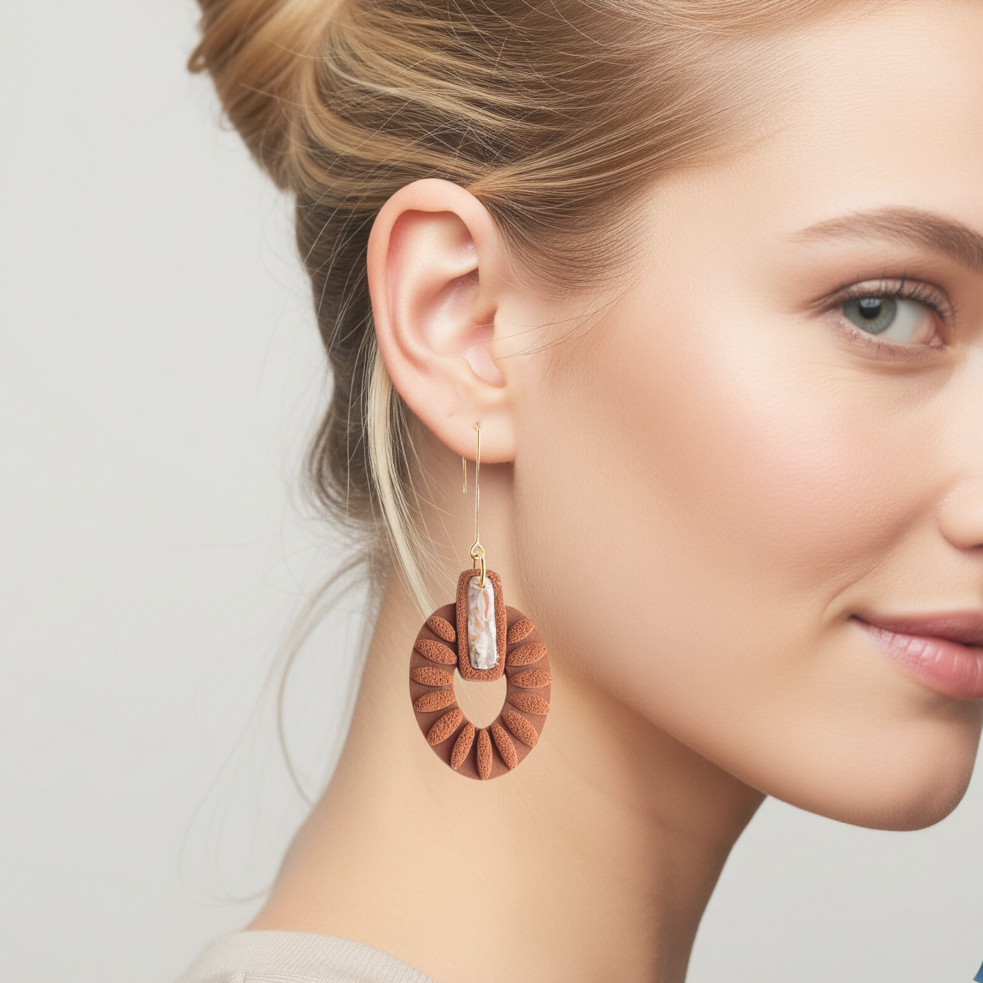 These Terracotta Marble Inlay Statement Earrings provide a Western concho design for a chic, boho look. Handmade from lightweight polymer clay, they offer comfortable wear for everyday style. Featuring surgical steel ear wires ideal for sensitive ears, and a convenient clip-on option, these earrings blend artistry and practicality effortlessly. The perfect birthday gift for you or your country girl best friend.