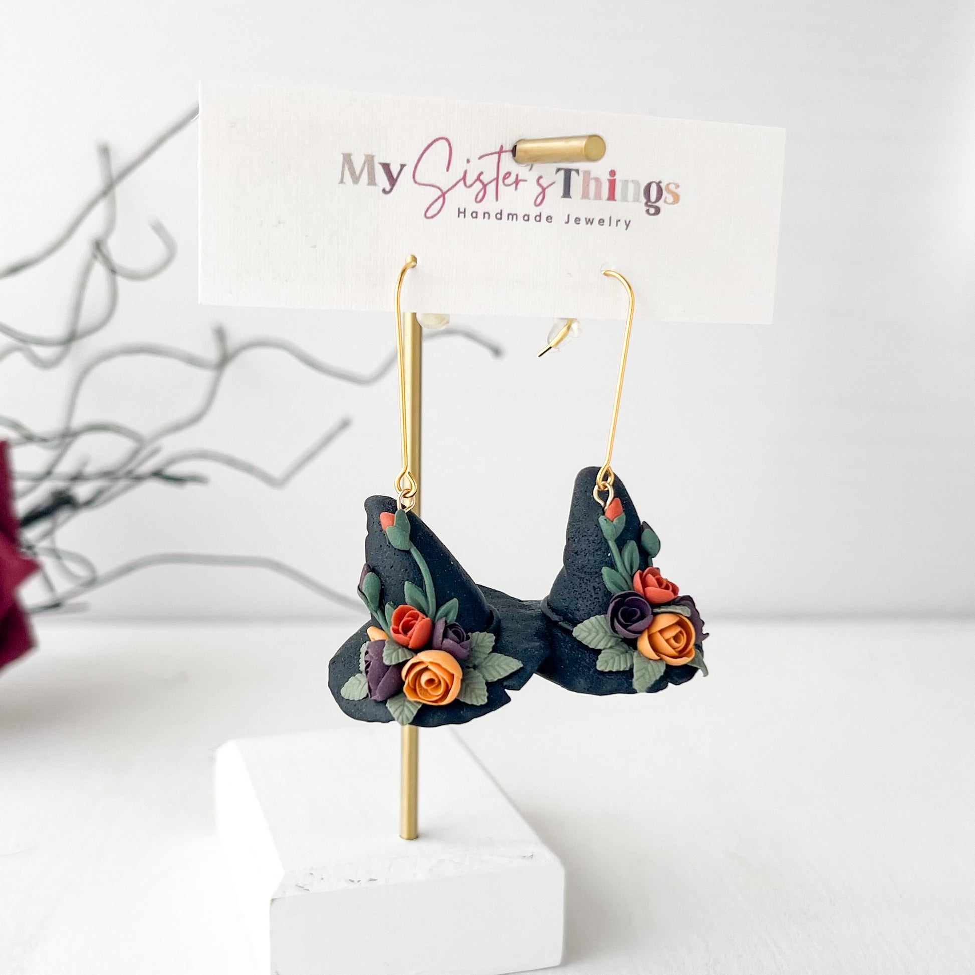 Floral Witch Hat Earrings: Fall Halloween Jewelry, Cottagecore Accessories